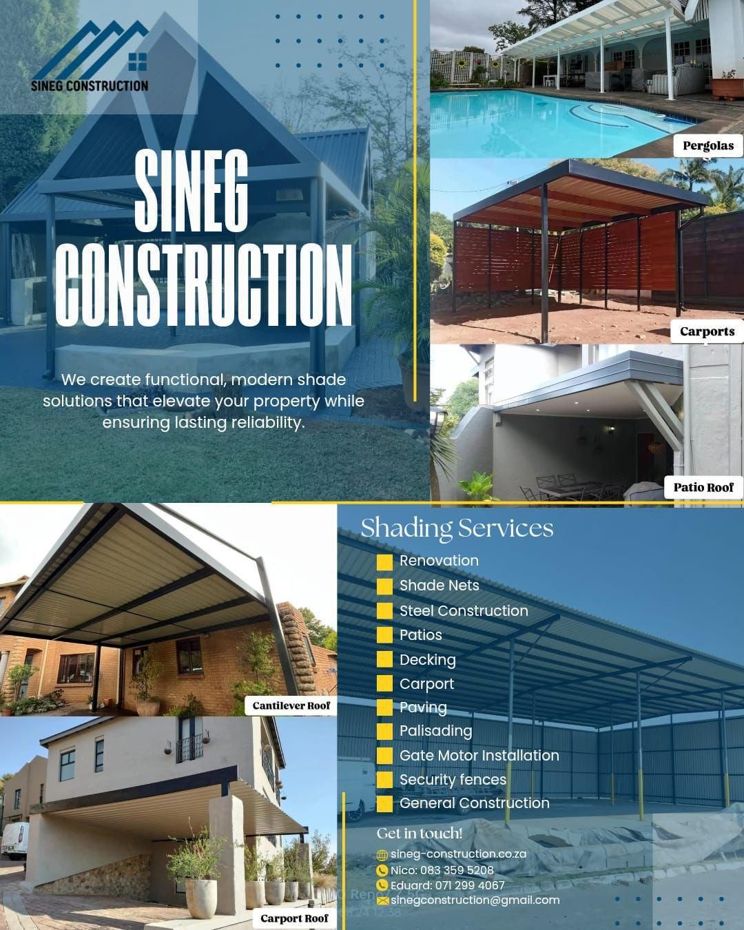 At Sineg Construction, we specialise in creating functional, modern, and visually striking shade solutions that enhance and protect your property. With a strong commitment to quality workmanship, we design and build structures that don’t just look exceptional—they stand the test of time.